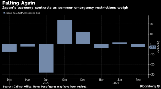 日本經濟在過去八個季度中有五個季度出現萎縮。 夏季的一波新冠疫情衝擊該國經濟,導致消費下降。 供應鏈緊張也衝擊了生產,日本製造商面臨晶元和零元件供應不足的局面。