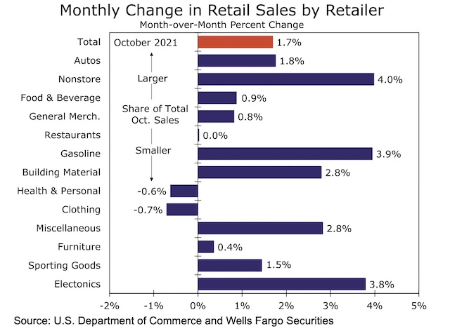 美國商務部16日公佈的數據顯示,美國零售銷售額連續3個月上漲,10月環比漲幅達1.7%,高於市場預期的1.4%,為今年3月以來的最大單月漲幅。 10月零售銷售較去年同期漲幅達16.3%,較疫情前水準高出21.4%。