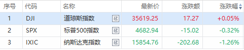 道鐘斯(35804.3789, -9.42, -0.03%)指數小幅收陽,而納斯達克(15845.2257, 70.09 , 0.44%)和標普500指數相繼收跌。