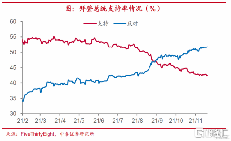 拜登目前民众支持率持续走低,从任期开始的53%降到目前的43%左右,反对率也从任期开始的36%持续上升到目前的52%左右。与二战来历任总统相比,其支持率仅仅好于上任总统特朗普,面临较大压力。