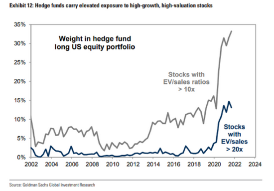 在高盛編製數據文件中顯示,去年第四季度初,企業價值超過銷售收入十倍的公司占對沖基金所持股票的三分之一,這是自2002年以來的最高水準。