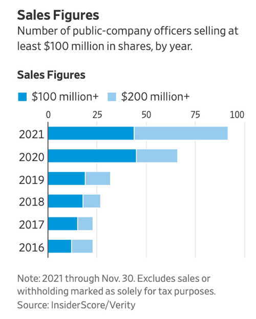 《華爾街日報》對調研公司InsiderScore的數據進行了分析,結果表明到目前為止,今年有48位高管的股票銷售額超過2億美元,約為2016年至2020年平均水準的四倍 。