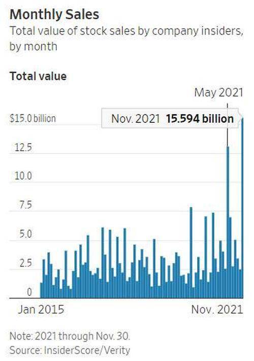 InsiderScore 數據顯示,截至11月,企業內部人士出售了令人難以置信的635億美元股票,與2020年全年相比增長了50%。