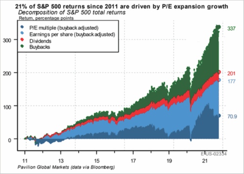 如果不是股票回購,企業內部人士永遠無法輕易在估值較高的水準拋售股票。 彭博社援引研究機構pavilion global market數據顯示,當前牛市中的40%完全是因為回購。