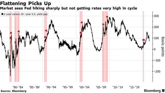 美債收益率趨平表明,投資者認為美聯儲或因經濟增長擔憂提前結束加息。 當經濟增長處於危險之中,曲線甚至可能發生逆倒掛。 當前美債收益率遠低於美聯儲2.5%的長期政策利率預期,甚至低於其預期的2024年達到的1.8%。