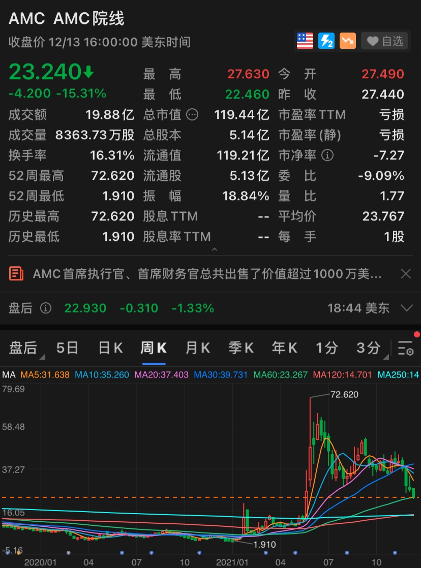 AMC院線股價報23.240美元/股,下跌超15%,當月跌幅超過31%,創6月份以來的最低水準。