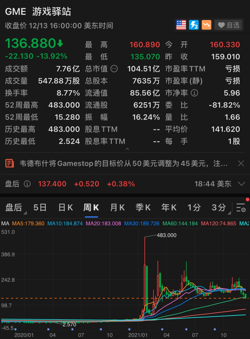 截至美股收盤,GameStop報136.880美元/股,暴跌近14%,當月累計跌幅達30%,創8個月以來新低。