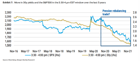 以霍恩巴赫(Matthew Hornbach)為首的摩根士丹利策略師總結稱,養老基金平衡投資組合的操作可能是債券市場和美股在收盤時出現異動的原因,並且促使收益率曲線趨平。