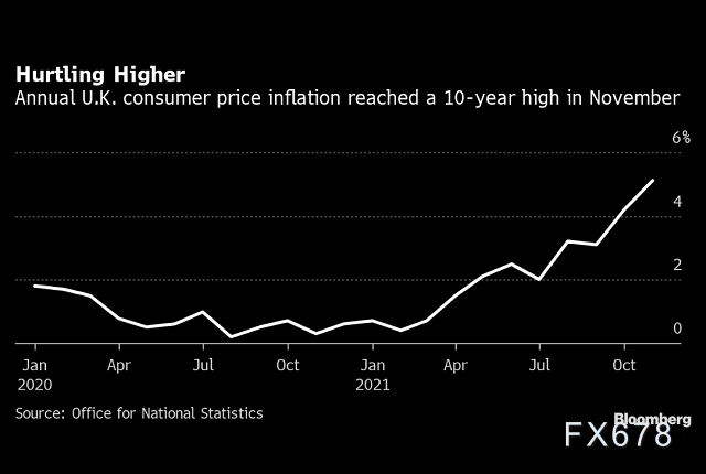 英國11月份通脹率升至逾十年來的最高水準,比英國央行預期的提前數月突破了5%的關口。 根據周三公佈的數據,服裝、汽車燃料和二手車價格的上漲推動消費者物價指數(CPI)同比上揚5.1%。 不計能源和其他波動率較高的商品,核心通脹率升至4%,為1992年以來的最高水準。 總體CPI環比走高4.2%,短短4個月上漲了3.1個百分點,創紀錄最快漲幅。