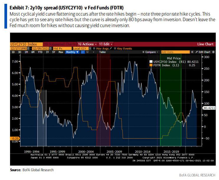 此刻,美聯儲面臨進退兩難的困境:要麼放任通脹預期上升,要麼必須接受收益率曲線趨平,衰退幾率增加。 本周美聯儲宣佈加速縮減購債規模,美銀預計將最早在2022年3月加息25個基點(甚至50個基點)。 作為回應,第一季度市場可能出現避險事件。 本周FOMC會議只是大轉變的前奏。
