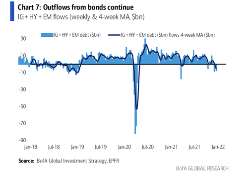 根據美國銀行(43.16-0.72, -1.64%, ) 的Michael Hartnett編製的最新EPFR數據,上周也出現了自2020年7月以來規模最大的被視為"安全區"的美國國債的資金流入,達到36億美元;同時,IG債券也出現了自今年3月以來的最大規模資金流出,達到64億美元;HY&EM債券出現了自去年4月以來的最大規模的資金流出,達到29億美元。