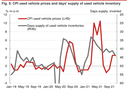 野村表示,12月初二手車批發價格上漲3.1%強化了其預期,預計至少在2022年二月份之前CPI中的二手車價格指數可能會繼續上漲,在明年一月份開始緩和。