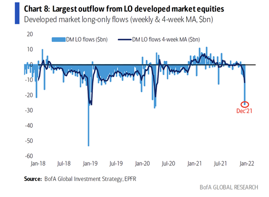 然而就在上周,僅做多發達市場的股票基金出現了2020年4月以來最大的資金外流,流出規模達到260億美元,這是市場情緒可能早已見頂的明確信號。