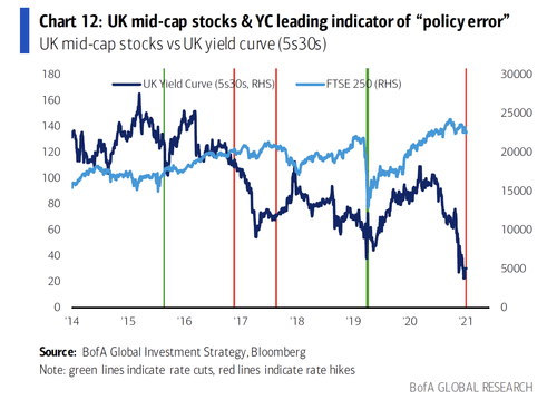 根據Hartnett的說法,英國中型股和收益率曲線是「政策錯誤」的最佳領先指標:在2017年和2018年英國央行進行加息時,市場出現了大幅拋售。