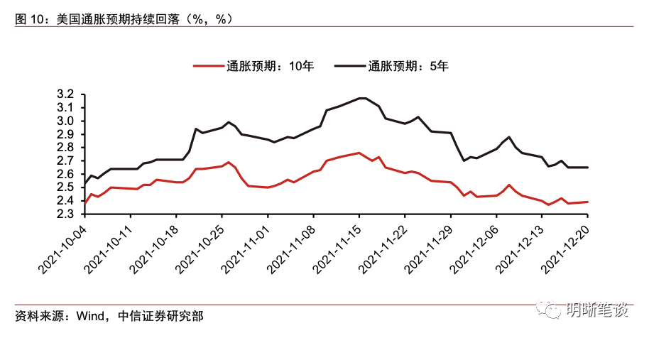 美聯儲近期不斷強化對於通脹的擔憂並釋放鷹派信號實際是對市場通脹預期實施的有效管理。 我們此前在《債市啟明系列20211203—Omicron來襲,Transitory不再,美聯儲與美債利率何去何從? 》(2021-12-03)中提到,鮑威爾拋棄"通脹暫時論",同時表示加快Taper是合適的,實際上是在管理市場的通脹預期。 隨著通脹數據不斷創新高,如果鮑威爾繼續維持"通脹暫時論"的判斷,則會讓市場認為美聯儲將繼續對通脹坐視不管,進而推升市場的通脹預期;而當鮑威爾向市場傳達通脹非暫時信號時,反倒會讓市場認為美聯儲可能開始重視通脹而使通脹預期下降。 事實證明,在美聯儲接連發出鷹派信號后,市場的通脹預期也的確開始回落,即便是在11月CPI增速創39年新高時,通脹預期仍然沒有明顯走高。