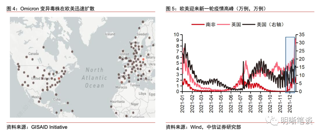 美聯儲宣佈加速Taper后,市場對於貨幣政策收緊的預期落地,交易邏輯轉向Omicron變異毒株。 11月30日,鮑威爾在參加參議院銀行委員會聽證會時,一改"通脹暫時論"的表述,同時表示美聯儲可能更快地完成Taper,將在12月的FOMC會議上進行討論,此後加息預期和通脹預期的博弈主導美債利率的交易,Omicron變異毒株出現后,由於數據較少,且大部分病例報告為輕症,因此彼時Omicron毒株僅是擾動因素。 12月FOMC議息會議美聯儲正式宣佈Taper加速,市場對於貨幣政策緊縮的預期落地,且預期加息時點最早不會早於明年3月。 同時,隨著Omicron變異毒株的擴散增加,美債利率的交易邏輯轉向由Omicron變異毒株主導。