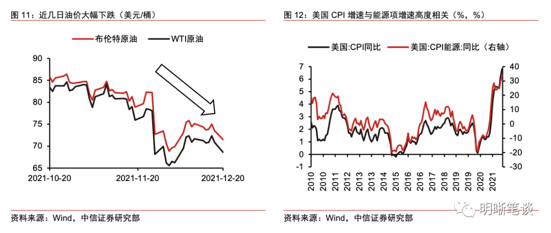 除了美聯儲的預期管理外,Omicron變異毒株衝擊下,最近幾日油價暴跌,同樣推動了通脹預期回落。 在Omicron變異毒株首次發現時,布油期貨結算價格即從82.22美元/桶下跌至72.72美元/桶;儘管此後油價企穩回升,但最近幾日Omicron變異毒株導致疫情日趨嚴重,油價再次大幅跳水。 今年以來,以油價為代表的能源價格是推動美國CPI快速上漲的重要原因,因此,近幾日油價的大幅下跌也對市場通脹預期的下調起到了關鍵作用。