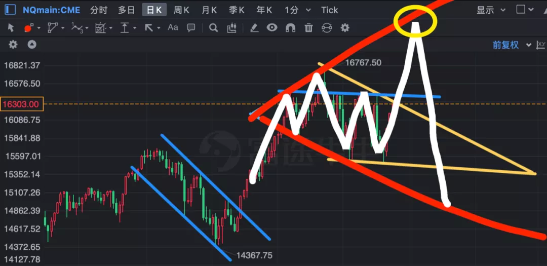納指期貨的技術形態也暗示了最終的結果,當前市場明顯形成了一個擴散三角形,短期確實還要去進攻擴散三角形的上邊緣,差不多對應17600,換算成納指,差不多就是16800,對應還有接近1500點的上漲空間。