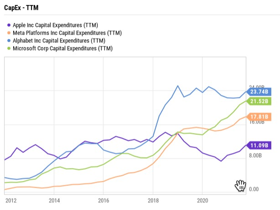 蘋果整體的資本支出僅為110億美元,相比之下,Meta Platforms光在元宇宙方面的投入就已經超過100億美元。 谷歌(2930.091.13, 0.04%, )母公司Alphabet每年在AV技術等方面的投入約為240億美元。 就連微軟(341.950.70, 0.21%, )(MSFT.O),資本支出都達到240億美元。 跟其他萬億級別市值的公司相比,蘋果的資本支出少了一半。