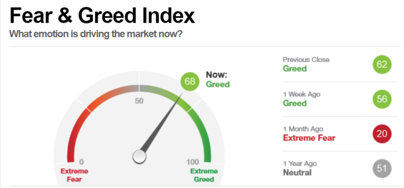 CNN恐懼與貪婪指數在高位徘徊,顯示出貪婪的跡象,其中三個指標處於極端貪婪的水準。 就在一周前,該指數還在閃爍"恐懼"警告信號,而一個月前,它還處在"極端恐懼"區域。