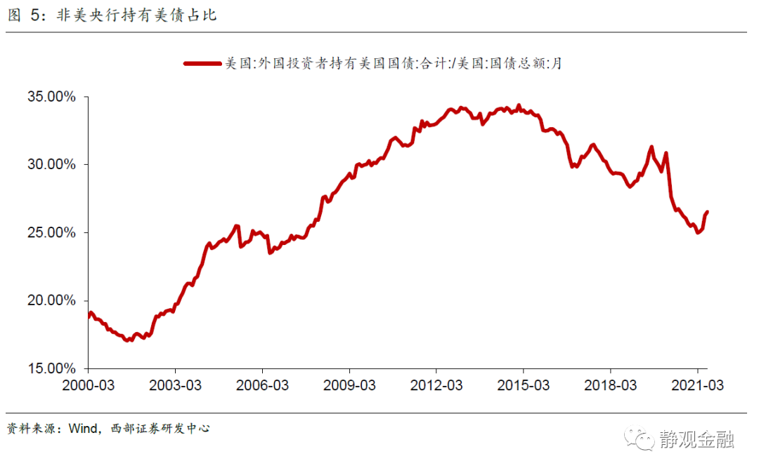 金融危機後,QE的出現意味著美聯儲已將財政因素納入其貨幣政策框架,發展中國家與地區仍沿用此前的"經濟—通脹—匯率"框架,疫后美國與非美貨幣政策框架分化的形勢則進一步加劇。 此外,QE的結果是美聯儲持有美債佔比大幅上升,美債的循環機制被打破,降低了美債吸引力。 進而,只要財政赤字率下降,美聯儲就必須通過縮表令其貨幣政策正常化,將其貨幣政策框架重新調整到與非美一致的狀態來維護美元貨幣體系的穩定性。