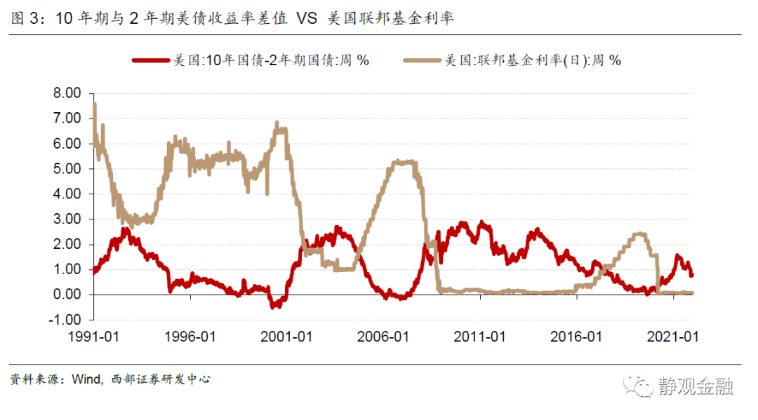 進而,儘管在低基數和疫后恢復等多重因素的助力下,2021年美國經濟增速極其強勁,但10年期美債收益率仍然低於疫前水準,10年期TIPS收益率更是始終保持在歷史較低水準。 這就有了一個大麻煩! 長短端美債收益率差值始終過低。 如圖3所示,歷次加息周期開始前10年期與2年期美債收益率差值都在2%以上,這裏的長短端利差代表了整個加息週期的加息空間。 一般情況下,經濟復甦到過熱初期(加息前)利差走擴,加息開始後利差就將快速收斂。 一旦利差倒掛則經濟衰退風險就將大幅上升,加息前2%的長短端利差相當於是加息的安全墊,意味著美聯儲手中有6-8次加息的許可權。