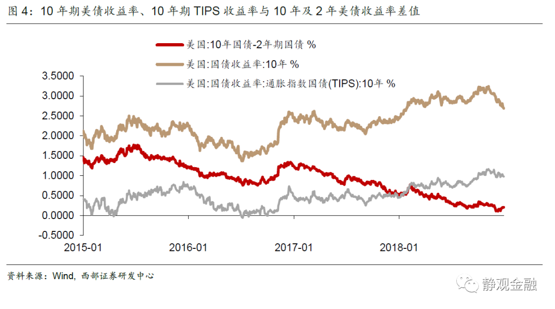 2013-2018年美聯儲貨幣政策節奏如下:2013年5月引導Taper預期→2014年Taper→2015年12月首次加息→2016年12月第二次加息→2017年3月、6月兩次加息后,2017年9月宣佈自當年10月起縮表,2017年12月繼續加息→2018年加息四次同步縮表→2019年結束緊縮。 如圖4所示,儘管2017年10月-2018年間10年期與2年期美債利差仍在收斂,但在縮表(以及經濟回升)背景下,此間10年期美債收益率特別是10年期TIPS收益率中樞顯著高於縮表前,說明縮表對減緩利差收窄效果顯著,進而為美聯儲提供了更多次加息籌碼。