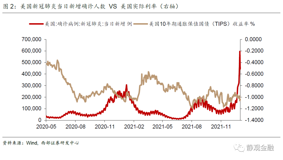 美聯儲數量型政策工具(QE)是將財政因素納入政策框架的產物。 金融危機后每當財政赤字率超過美國名義增長時,美聯儲就會通過QE的方式説明財政緩解債務支出壓力,財政刺激不退出QE就不會結束,因此此間無論經濟增速如何美聯儲都將保持積極的貨幣政策並通過QE地方式抑制10年期美債收益率(尤其是實際利率)的回升。 此外,作為安全資產美債與不確定性勢必存在聯繫,進而疫后每當美國疫情反彈之際,10年期TIPS收益率(實際利率)就會走低、每當疫情降溫10年期TIPS收益率就會反彈。
