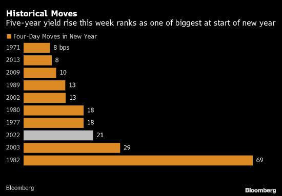 5年期美國國債收益率四天時間上漲21個基點,這樣大的漲幅是近二十年來同期所未見的,殃及從高估值的科技股到加密貨幣在內多種資產暴跌。