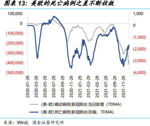 短期,疫情反覆與防控是影響經濟最重要的變數,也是影響匯率最重要的變數;重點關注每百人疫苗接種量,線下消費修復進度等指標。 Omicron對新增病例死亡率的影響程度明顯低於前幾輪,美歐的死亡病例之差、每百人新冠疫苗接種量之差逐步收斂,意味著歐元區經濟復甦彈性空間打開,歐元兌美元升值壓力漸顯。 此外,疫情反覆下避險情緒的逐漸消退,也在減弱美元上行力量。