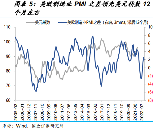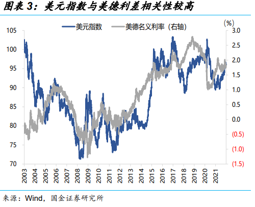 加息週期中,美元指數升值還是貶值,與美國與非美經濟體之間相對強弱程度變化緊密相關,尤其美歐之間的差異。 匯率走勢主要是對經濟體之間相對強弱程度變化的刻畫;美元指數的構成中歐元佔比最大(57.6%),美元走勢與美歐經濟基本面的相對強弱變化,以及美歐之間貨幣流動性環境的變化關聯密切。 歷史回溯來看,美元指數與美德利差走勢高度溫和,即是反應。