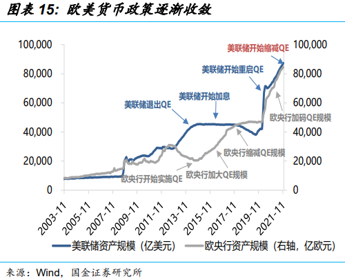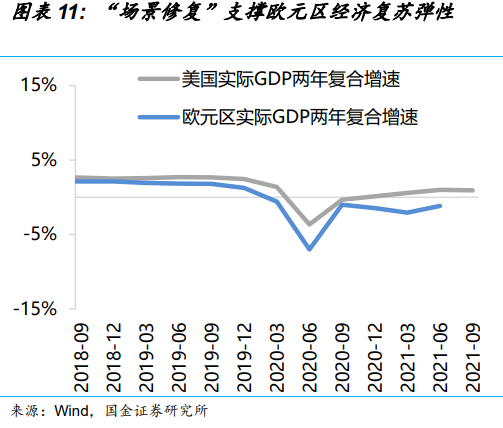 疫後「場景修復」更有利於歐元區經濟彈性恢復,進一步確認美元的下行趨勢。 一方面,在疫情擾動加劇、能源品價格上漲、供應鏈中斷背景下,歐元區的通脹大幅上升,但需求恢復受到約束。 歐央行宣布結束新冠肺炎疫情期間實施的緊急資產購買計劃、英國央行宣佈將基準利率從0.1%提升至0.25%,釋放退出超寬鬆貨幣政策信號。 另一方面,我們在《美元何時見頂? 》中指出疫苗和特效藥的快速發展加速「場景修復」的進程,歐元區經濟復甦的彈性有望得到加強,這將導致歐美央行貨幣政策從分化轉向收斂,確認美元的下行趨勢。
