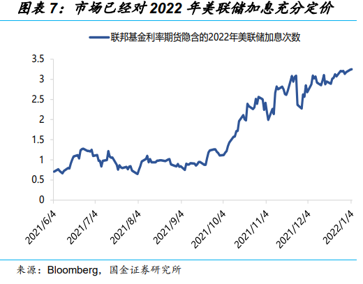市場對美聯儲加息定價已經相對充分。 從市場對美聯儲加息節奏的定價來看,美聯儲點陣圖對市場預期的引導已經達到2022年和2023年各升息3次,在此背景下,聯邦基金利率期貨蘊含的 2022年的美聯儲加息次數已經穩定在3次以上,市場對美聯儲加息的時間節點也已經前移到3月份,並對"縮表"開始進行定價。 近期,美聯儲對貨幣政策態度總體偏「鷹」 ,但綜合考慮來看,市場對美聯儲的加息定價或許已經較為充分。