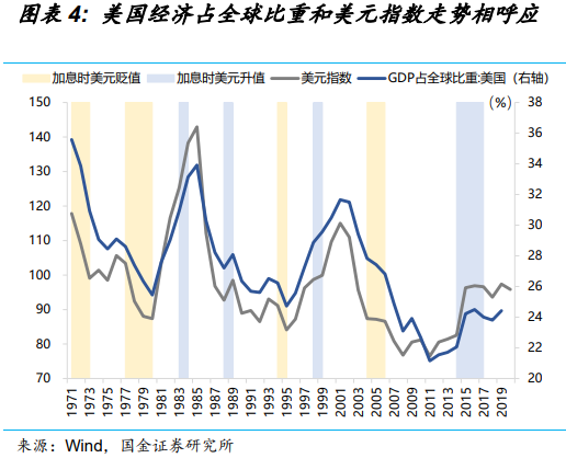 歷史回溯也指向上述結論,即加息過程中,美元的升貶值主要取決於美國與非美經濟體經濟相對強弱的變化。 從美國經濟占全球比重和美元指數走勢來看,在1971-1973年、1977-1980年、1994-1995年和2004-2006 年美聯儲加息美元貶值時,對應美國經濟佔全球比重下行;而在1984-1985年、1988-1989年、1999-2000年、2015-2018 年美聯儲加息美元升值時,對應美國經濟佔全球比重上行,進一步說明美國和其他國家的相對經濟增速、經濟節奏差異決定了美元指數的走勢。