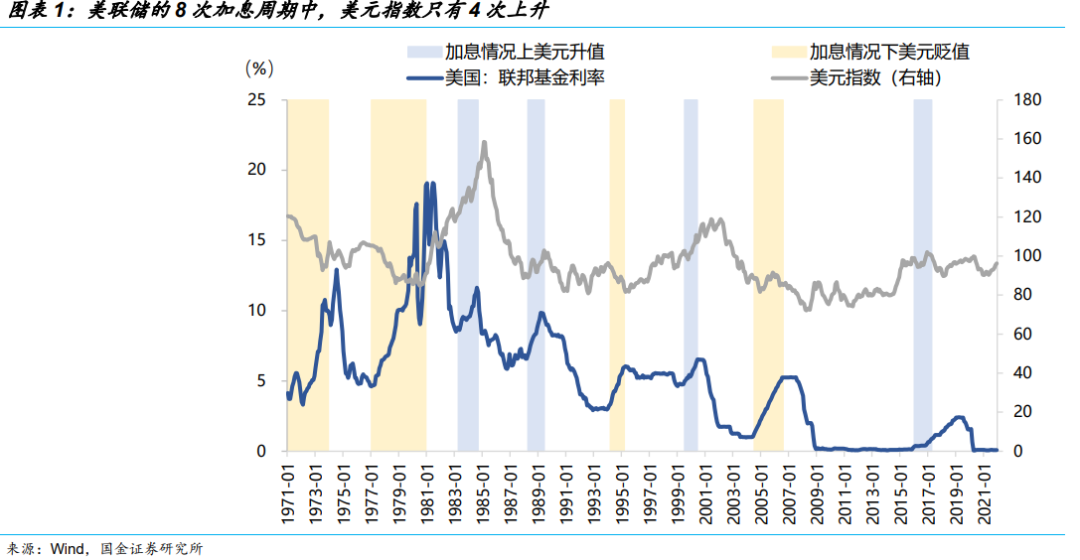 過去50年大歷史回溯來看,美聯儲加息與美元升值之間並沒有明顯的相關性。 1970年以來,美聯儲共有8輪較為明顯的加息週期,加息過程中,美元指數4次上漲、4次下跌,升貶值概率各佔一半。 美元貶值的加息週期:1971-1973年、1977-1980年、1994-1995年、2004-2006年;美元升至的加息週期; 1984-1985年、1988-1989年、1999-2000年、2015-2018年。
