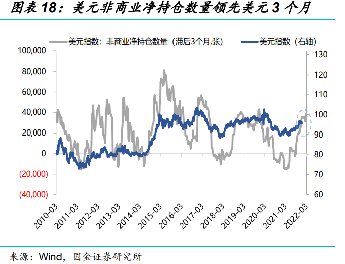 技術指標顯示,當前美元匯率已接近超買的臨界點,「見頂」在即跡象已現。 美元對歐元14天RSI指標,已接近均值+1倍標準差位置,依歷史經驗,眼下離岸美元兌歐元已接近超買的極值。 其次,美元非商業凈持倉數量領先美元指數3個月左右,該指標指向美元或將在2022年2月前後見頂。
