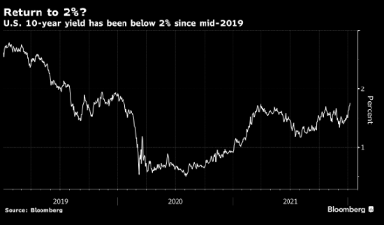 美債收益率持續攀升已引來人們將其與一年前的大幅漲勢進行比較,當時的漲勢在2021年的前三個月一直持續。 今年以來,10年期收益率從去年12月31日的1.51%到上週五一度上升至1.8%,創2020年1月以來最高水準。 這為市場很快挑戰彭博調查中策略師預計的2.04%年末目標奠定基礎。