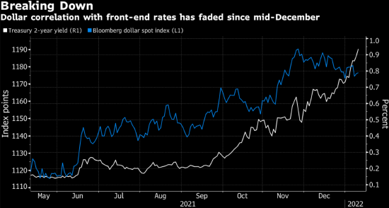 美國兩年期國債收益率週二升破0.94%,觸及疫情爆發前水準,貨幣市場轉向預測美聯儲今年加息四次。 然而, 彭博美元即期指數未能較2021年底觸及的六周低點明顯上升。