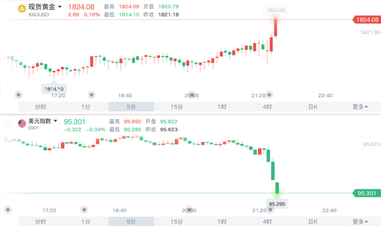 數據公佈后,現貨黃金短線走高,站上1820美元關口;現貨白銀短線走高0.1美元,站上22.9;美元指數持續走低至95.3附近,10年期美債收益率同樣短線走低,至1.72%。