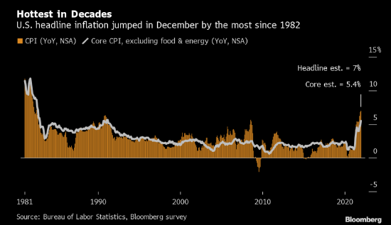 根據勞工部周三發佈的數據,2021年消費者價格指數上漲7%,為1982年以來在最大12個月漲幅。 12月份CPI環比上漲0.5%,超出預期。