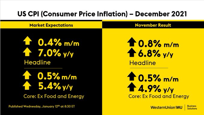展望日內,市場將密切聚焦於美國勞工部今晚21:30將公佈的美國12月CPI數據。 根據媒體對經濟學家的調查預計,美國12月CPI料將環比上漲0.4%,同比上漲7%,這將是自1982年2月以來最大的同比漲幅。 剔除波動較大的食品和能源價格,美國12月核心CPI也料將環比上漲0.5%,同比上漲5.4%。