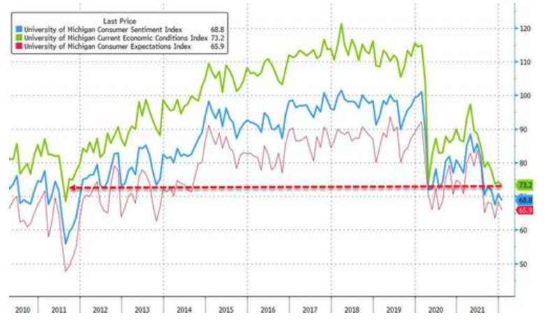 財經金融博客Zerohedge點評稱,Delta和Omicron變種病毒肯定促成了消費者信心的下降,同時通貨膨脹上升也令人們的信心下滑。
