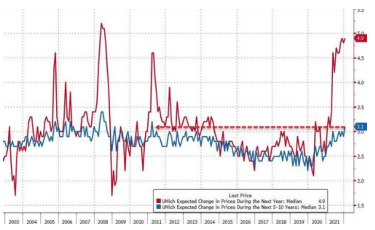 市場備受關注的通脹預期方面,消費者預計明年通脹率將上升到4.9%,預期4.8%,12月為4.8%。 他們預計未來5到10年價格將以每年3.1%的速度上漲,這創下了2011年1月來最高,12月為2.9%。