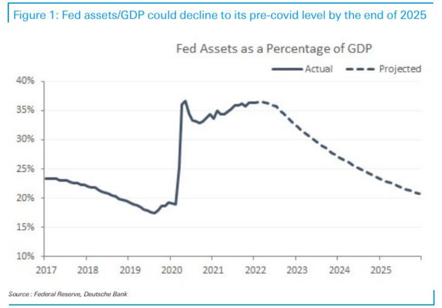 德意志銀行預測,一旦量化緊縮QT開始,美聯儲的資產負債表將從目前的9萬億美元縮減到6萬億美元。