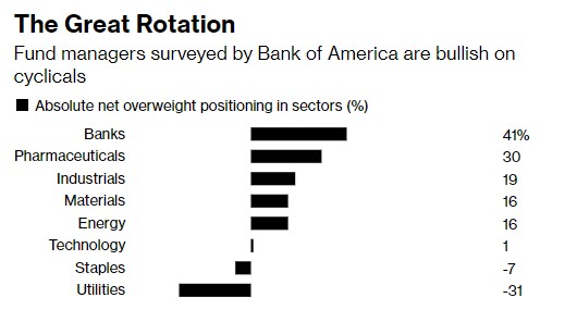 以Michael Hartnett為首的美銀策略師在一份報告中寫道:"全球經濟重新開放的希望,壓倒了對美聯儲加息的擔憂。 "他們表示,市場參與者正從債券轉向大宗商品,從增長型股票轉向價值類股,從科技股轉向銀行股。