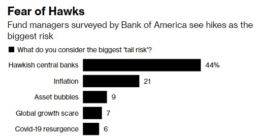 接受調查的投資者預計美聯儲將在2022年加息三次。 最大的尾部風險是各大央行進行激進地加息,然後是通貨膨脹、資產泡沫、全球經濟增長恐慌、新冠病毒捲土重來。