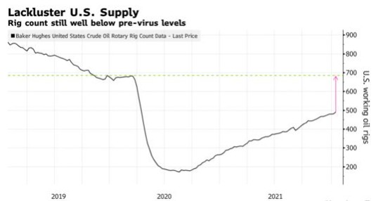 根據Baker Hughes的數據,美國正在使用的石油鑽井平臺數量已從2020年下半年的不足200個回升至近500個,但仍比2020年3月的水準低200多個。