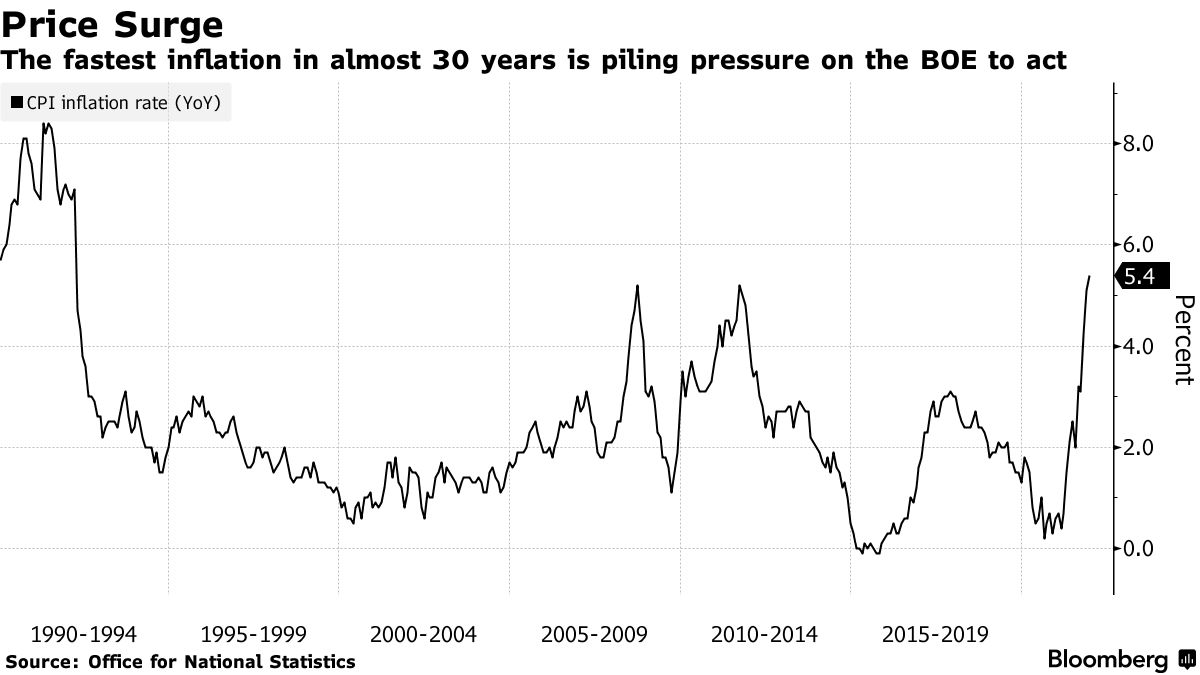 英國央行政策制定者擔心,2022年上半年的通脹率可能會錄得6%,達到央行目標的三倍。 上個月,英國央行宣佈上調基準利率15個基點至0.25%,實現了自新冠大流行爆發以來的首次加息。 不過,繼續上行的通脹預示,僅僅一次加息可能遠遠不夠。
