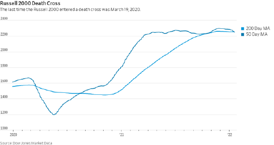 羅素2000指數的50日均線已低於200日均線。 據悉,當50日均線走到200日均線下方時,就會出現所謂的"死亡交叉",許多技術分析人士稱,這意味著短期回調演變成了長期下行趨勢。