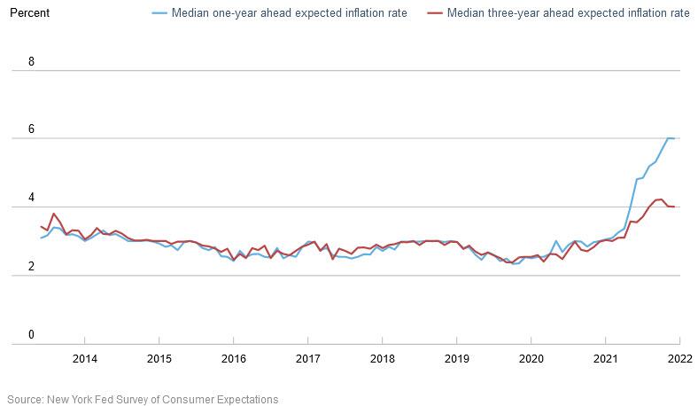 在普通民眾方面,紐約聯邦儲備銀行(New York Federal Reserve)去年12月對消費者通脹預期(Consumer Inflation Expectations)進行的調查顯示,美國普通消費者預計未來三年價格將上漲4%,這是自2013年開始這項調查以來的最高水準,是美聯儲同期預期的兩倍。
